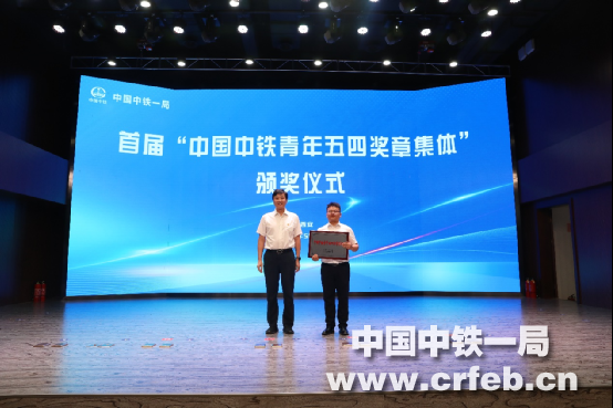 樊朝臣為獲得首屆“中國(guó)中鐵青年五四獎(jiǎng)?wù)录w”中鐵一局高原鐵路CZSCZQ-11標(biāo)項(xiàng)目部二分部青年突擊隊(duì)代表頒發(fā)獎(jiǎng)牌