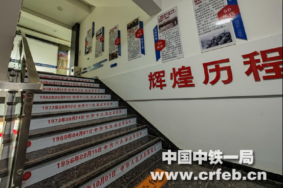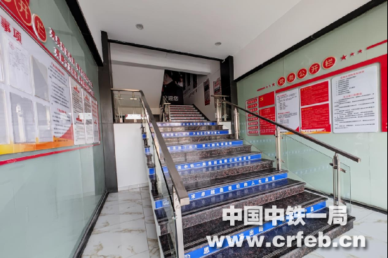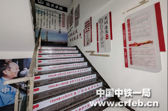 一樓,左側(cè)墻面廠務(wù)公開欄,將項(xiàng)目部的有關(guān)工作公布于眾,讓每一名員工有知情權(quán),能調(diào)動員工參與管理的積極性;右側(cè)的墻面黨務(wù)公開欄里,有“黨員權(quán)利”“黨員義務(wù)”以及“黨支部工作職責(zé)”等內(nèi)容,既讓黨員們時時牢記自己的使命,又能起到請群眾監(jiān)督黨員的作用。在樓梯的下部臺階立面除了企業(yè)核心價值觀等等,還張貼了“既然選擇了遠(yuǎn)方,便只顧風(fēng)雨兼程”“與其羨慕他人優(yōu)秀,不如自己努力奮斗”等等勵志標(biāo)語;上半部右側(cè)墻面,是黨的“輝煌歷程”知識,臺階立面張貼著黨的幾次代表大會召開的時間和地點(diǎn)等黨建歷史文化。在樓梯間的墻壁上,一幅習(xí)近平總書記接見中鐵一局電力工高級技師竇鐵成的大型照片映入眼簾,使員工們倍感親切、深受鼓舞、信心滿滿,員工的榮譽(yù)感、自豪感油然而生。