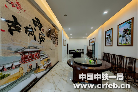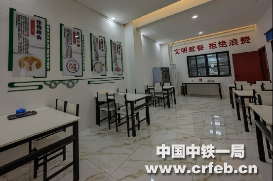 走入一樓項(xiàng)目員工生活區(qū),大門右側(cè)的小餐廳里,厚重的“古城西安”“雁塔晨鐘”“華岳仙掌”等陜西歷史人文文化,使占到項(xiàng)目部總?cè)藬?shù)近50%的秦人有一種“回到家鄉(xiāng)”的親切感;在大餐廳,“注意衛(wèi)生”“文明用餐”“光盤行動”等餐飲文化懸掛墻壁,提醒著員工珍惜糧食,牢記“粒粒皆辛苦”。