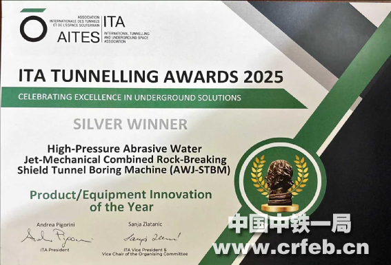 近日,2025年第十一屆國際隧道協會(ITA)隧道工程獎頒獎儀式在塞爾維亞貝爾格萊德舉行。中鐵一局五公司承建濟南軌道交通6號線東倉站至山東大學站區間隧道“高壓噴水機械組合破巖盾構隧道掘進機(AWJ-STBM)”技術獲“國際隧道與地下空間協會掘進獎2025年度銀獎”。