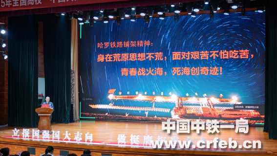 當馬建爭動情地說道:“如今,我們又再次向‘死亡之海’發起挑戰,再次向羅布泊腹地挺進,修建羅若鐵路。在無水、無電、無信號、無人煙的‘四無’之境,用青春的熱血與堅韌的意志書寫新時代的筑路傳奇”時,現場響起經久不息的掌聲。許多師生被建設者們無畏艱險、接續奮斗的精神深深打動,更為公司七十余年來建設新疆的偉大壯舉所震撼,真切感受到“中國共產黨人精神譜系”在新時代的生動踐行。馬建爭在最后號召青年學子,要勇當強國建設、民族復興征程上的開路先鋒,為了社會主義現代化強國建設,肩負起青年一代人的使命。