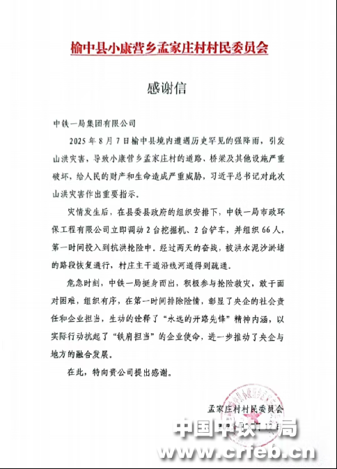 8月13日,中鐵一局市政環(huán)保公司歷經(jīng)3天的奮戰(zhàn),順利完成榆中縣小康營鄉(xiāng)孟家莊村的道路清淤,公司承接的榆中縣搶險(xiǎn)救災(zāi)第一階段道路搶通任務(wù)也宣告完成。孟家莊村村民委員會特贈送錦旗并發(fā)感謝信,感謝中鐵一局挺身而出,積極參與搶險(xiǎn)救災(zāi),生動詮釋“永遠(yuǎn)的開路先鋒”精神內(nèi)涵,扛起“鐵肩擔(dān)當(dāng)”的企業(yè)使命。