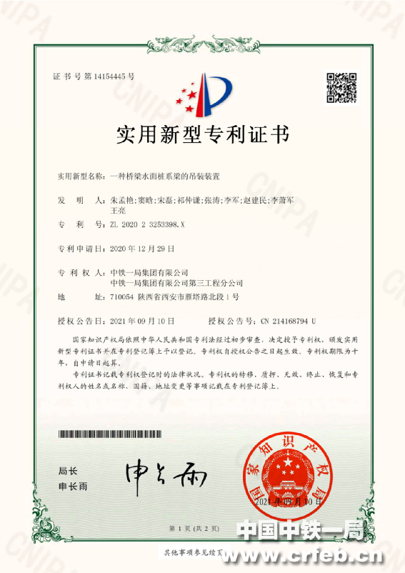 三公司研發的《一種橋梁水面樁系梁的吊裝裝置及其施工方法》,通過吊桿+調節螺母的機械升降結構與分階段模板安裝方法,解決了現有技術中工序復雜、成本高、污染風險大的問題。憑借在提升水上橋梁施工安全性和效率方面的突出優勢,先后獲評國家發明專利、實用新型專利以及日本發明專利。此次被確定為行業高推廣價值三等專利,是三公司在該獎項上的首次突破,為企業在專利轉化與推廣應用方面贏得了更廣闊的發展空間。