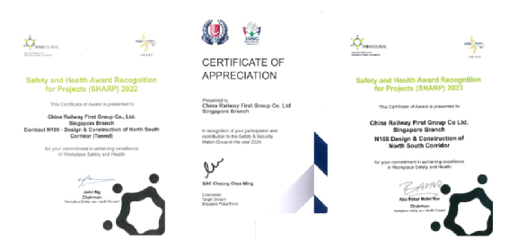 2019年,三公司成功叩開標(biāo)準(zhǔn)嚴(yán)苛的新加坡市場,中標(biāo)南北走廊N108項目,實現(xiàn)了在國際高端工程領(lǐng)域從“零”到“一”的重大突破。項目實施期間,團隊自主完成地連墻及鋼支撐等關(guān)鍵工序,憑借卓越的工程質(zhì)量與安全管理,2023年、2024年連續(xù)榮獲新加坡人力部頒發(fā)的“職業(yè)健康與安全先鋒獎”,2024年、2025年連續(xù)兩年蟬聯(lián)新加坡警察部隊“安全管理榮譽證書”,充分彰顯了企業(yè)在高端市場的卓越品牌影響力與技術(shù)創(chuàng)新實力。