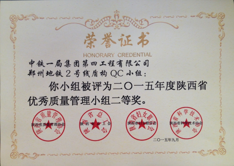 鄭州地鐵2號(hào)線盾構(gòu)QC小組被評(píng)為2015年陜西省優(yōu)秀質(zhì)量管理小組二等... -