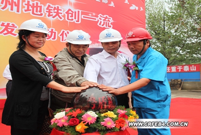 石銀生等四位勞模代表(右一)在鄭州地鐵一號線盾構啟動儀式上按下始發按鈕