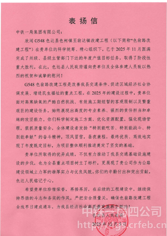 朦霧漫過色達金馬草原的經幡,將3900米海拔的清冽揉進冬日的風中。八百年前格薩爾王賽馬稱雄的草甸上,曾回蕩著茶馬古道“棧道千里,通于蜀漢”的滄桑駝鈴。近日,這千年的回響正被一場現代筑路史詩接續,國道548改擴建項目圓滿完成州級、縣級年度產值目標任務,取得了階段性重大勝利,并收到色達縣人民政府來信表揚,于川西高原的群山間,書寫著生態與創新并舉的時代新篇。