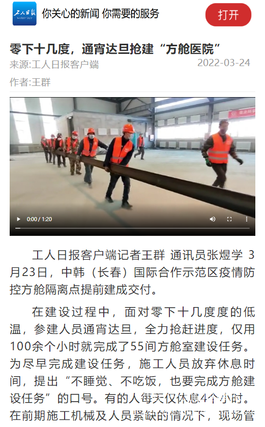 3月24日,工人日報報道公司援建吉林長春方艙醫院