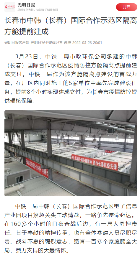 3月23日,光明日報報道公司承建的中韓(長春)國際合作示范區疫情防控方艙隔離點提前建成。