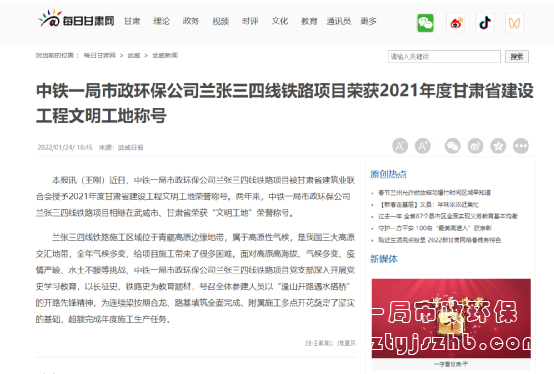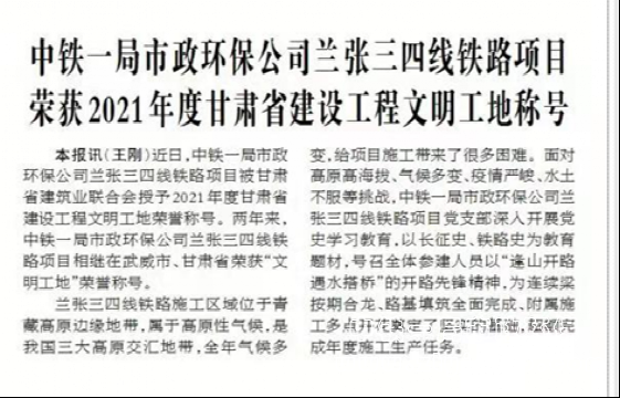 武威日報報道:中鐵一局市政環保公司蘭張三四線鐵路項目榮獲2021年度甘肅省建設工程文明工地稱號。