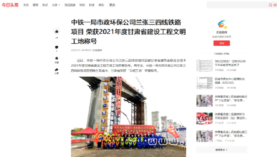 今日頭條報道:中鐵一局市政環保公司蘭張三四線鐵路項目榮獲2021年度甘肅省建設工程文明工地稱號。