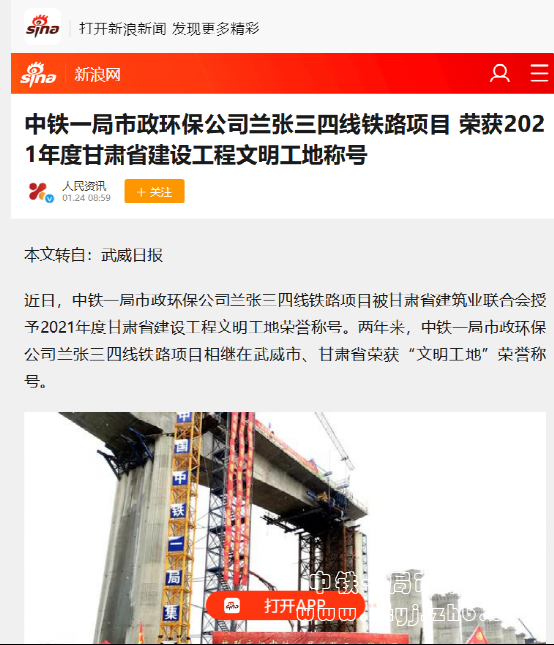 新浪網報道:中鐵一局市政環保公司蘭張三四線鐵路項目榮獲2021年度甘肅省建設工程文明工地稱號。