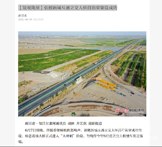 6月9月,中國張掖網報道:張掖新城互通立交大橋首箱梁架設成功