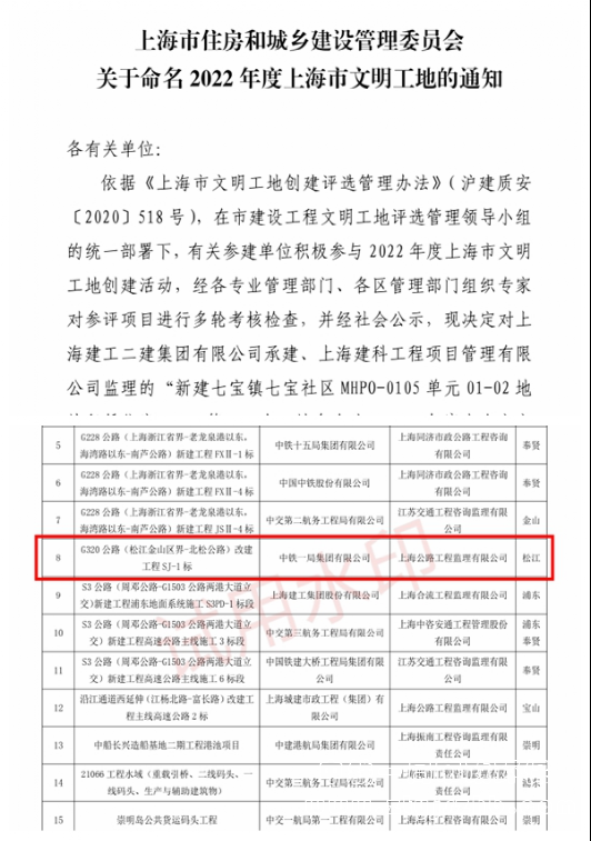 近日,在上海市住建部、交通委、工程質(zhì)量監(jiān)督站等多部門聯(lián)合組織的評比中,由公司承建的G320改建公路SJ-1標項目在上海市工程項目文明工地的評選中榮獲“2022年度上海市文明工地”榮譽稱號。