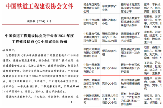 近日,從中國鐵道工程建設協(xié)會傳來喜訊,公司銀巴支線鐵路項目“銀巴QC小組”發(fā)布的《研制一種自移式連續(xù)梁混凝土養(yǎng)護裝置》成果,榮獲2024年度工程施工優(yōu)秀QC小組成果(國家級)“一等成果”榮譽稱號,并獲批國家知識產(chǎn)權(quán)局頒發(fā)的國家實用新型專利。同時該小組發(fā)布的《鉆孔樁樁頭破除工藝創(chuàng)新》成果,榮獲2024年度陜西省建筑業(yè)協(xié)會(省部級)優(yōu)秀QC小組成果“一等成果”。