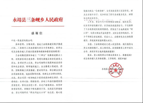 近日,蘭合鐵路項目部收到永靖縣三條峴鄉人民政府發來的感謝信,以及一面由所在地紅峴子村村委會贈送的“為民排憂解難 彰顯企業擔當”錦旗,感謝項目部主動擔責,既護住了鄉親們的安居夢,也保障了工程進度。