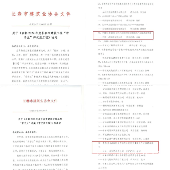 近日,長春市建筑業(yè)協(xié)會發(fā)布表彰決定,公司參建的中韓(長春)國際合作示范區(qū)優(yōu)質(zhì)文體促進(jìn)產(chǎn)業(yè)園建設(shè)項目榮獲2024年度長春市建筑工程“君子蘭”杯優(yōu)質(zhì)工程獎和2024年度長春市建筑裝飾工程“君子蘭”杯獎。