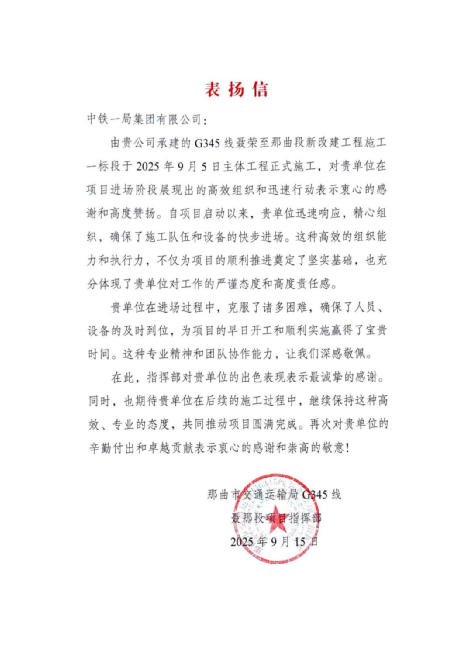 近日,那曲市交通運(yùn)輸局G345線聶那段項(xiàng)目指揮部發(fā)來表揚(yáng)信,對中鐵一局在G345國道聶榮至那曲段改建工程項(xiàng)目中的卓越表現(xiàn)予以肯定,表揚(yáng)公司在項(xiàng)目進(jìn)場階段高效組織、迅速行動,確保了施工隊(duì)伍和設(shè)備的快步進(jìn)場,為項(xiàng)目的順利推進(jìn)奠定了堅實(shí)基礎(chǔ)。