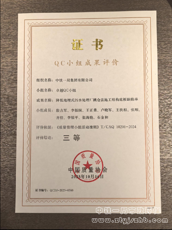 近日,中國質量協會召開全國第四十七次質量管理小組代表會議暨全國信得過班組建設經驗交流大會,公司組織申報的兩項QC成果在大會上獲得認證評價。勇進QC小組的《鐵路高邊坡深路塹數字化調配技術研發》和卓越QC小組的《降低地埋式污水處理廠跳倉法施工結構底板缺陷率》分別獲得一等和三等成果獎。