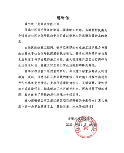 近日,中鐵一局贛州蓉江新區(qū)排水單元整治項目圓滿結(jié)束了當塘村的社區(qū)改造施工,當塘村村民委員會送來錦旗和感謝信,對項目在社區(qū)改造施工中的專業(yè)表現(xiàn)和辛勤付出表示感謝,并贊揚項目部的高效執(zhí)行力與專業(yè)施工組織能力。