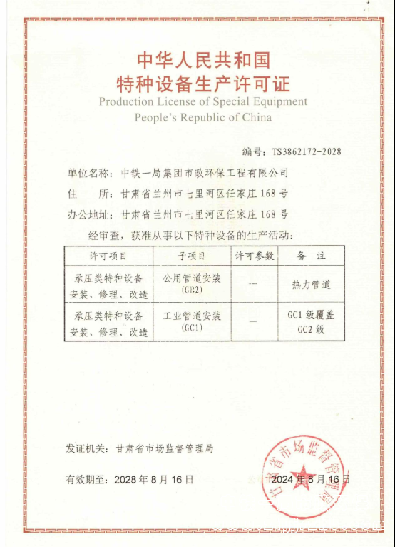 中國中鐵唯一!市政環(huán)保公司成功取得所有特種設(shè)備壓力管道安裝許可