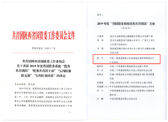 4月15日,省國資委團(tuán)工委公布了《關(guān)于表彰2019年度省國資委系統(tǒng)“優(yōu)秀共青團(tuán)員”“優(yōu)秀共青團(tuán)干部”“五四紅旗團(tuán)支部”“五四紅旗團(tuán)委”的決定》(陜國資團(tuán)發(fā)202007號),公司西南物供中心竇平被授予2019年度“陜西省優(yōu)秀共青團(tuán)員”稱號。