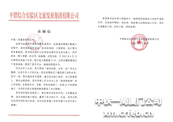 8月26日,平潭國際賽車場項目收到業主單位發來的表揚信,對項目部在整個項目推進過程中,精心組織、強化管控、攻堅克難,出色完成軟基處理排水板施工任務表示衷心感謝和高度評價。